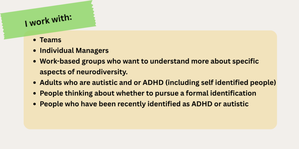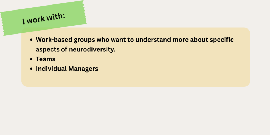 I offer bespoke training to groups and individuals who want to understand more about neurodiversity so that they can create more inclusive environments where people who think differently can thrive.