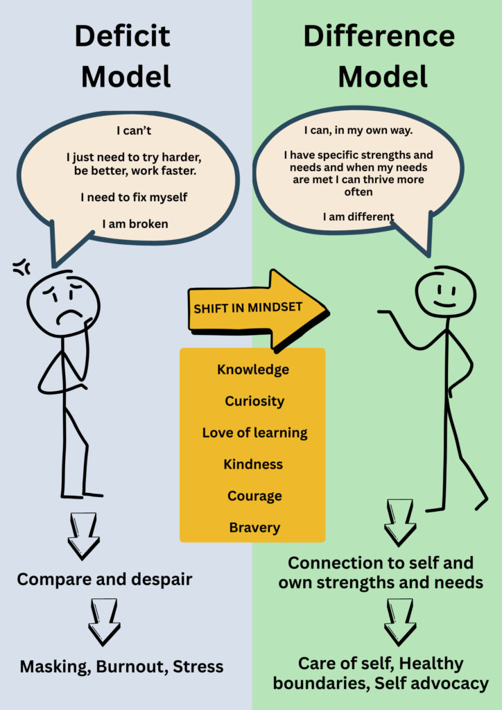 Instead of a deficit model, we can choose a difference model. This means understanding that our brains work differently, not wrongly. When we get curious about how we think, feel and learn, we can begin to ask, “What do I need to thrive?” instead of, “How do I fix myself?”