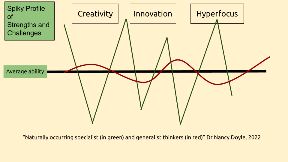 Many neurodivergent people have spiky profiles when it comes to their strengths and challenges, and not many of us can be described as great all-rounders. Understanding this spiky profile can help us think about what we need to use more of our strengths and identify workarounds to support our areas of challenge. Without understanding our spiky profile many of us discount our strengths (because they come easily and we associate success with effort) and beat ourselves up about our challenges, without stepping back to consider what we need to do differently to accommodate our challenges.